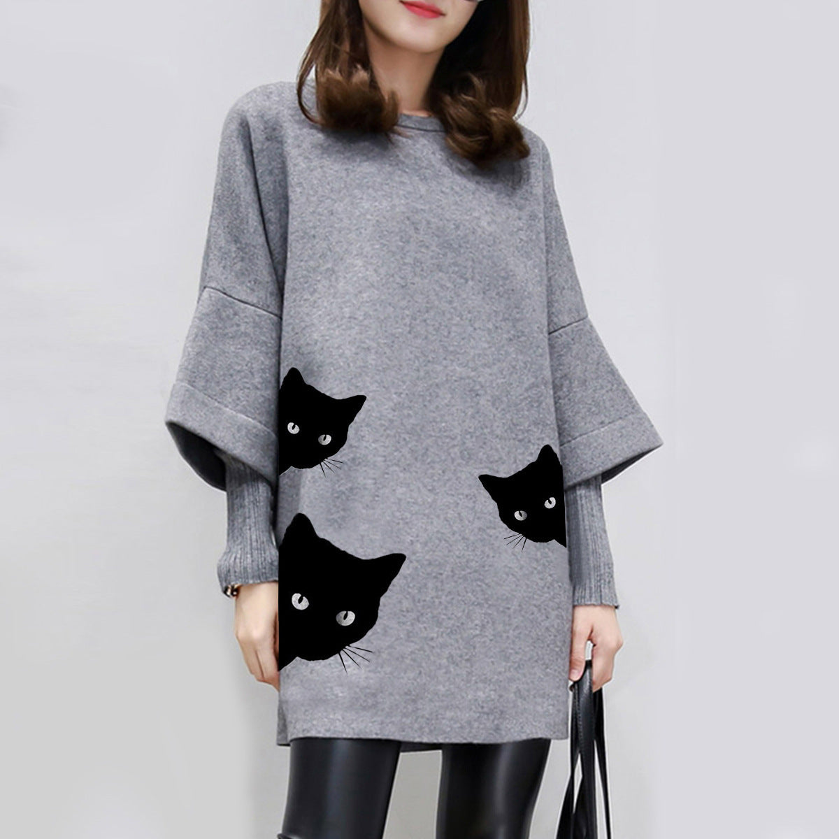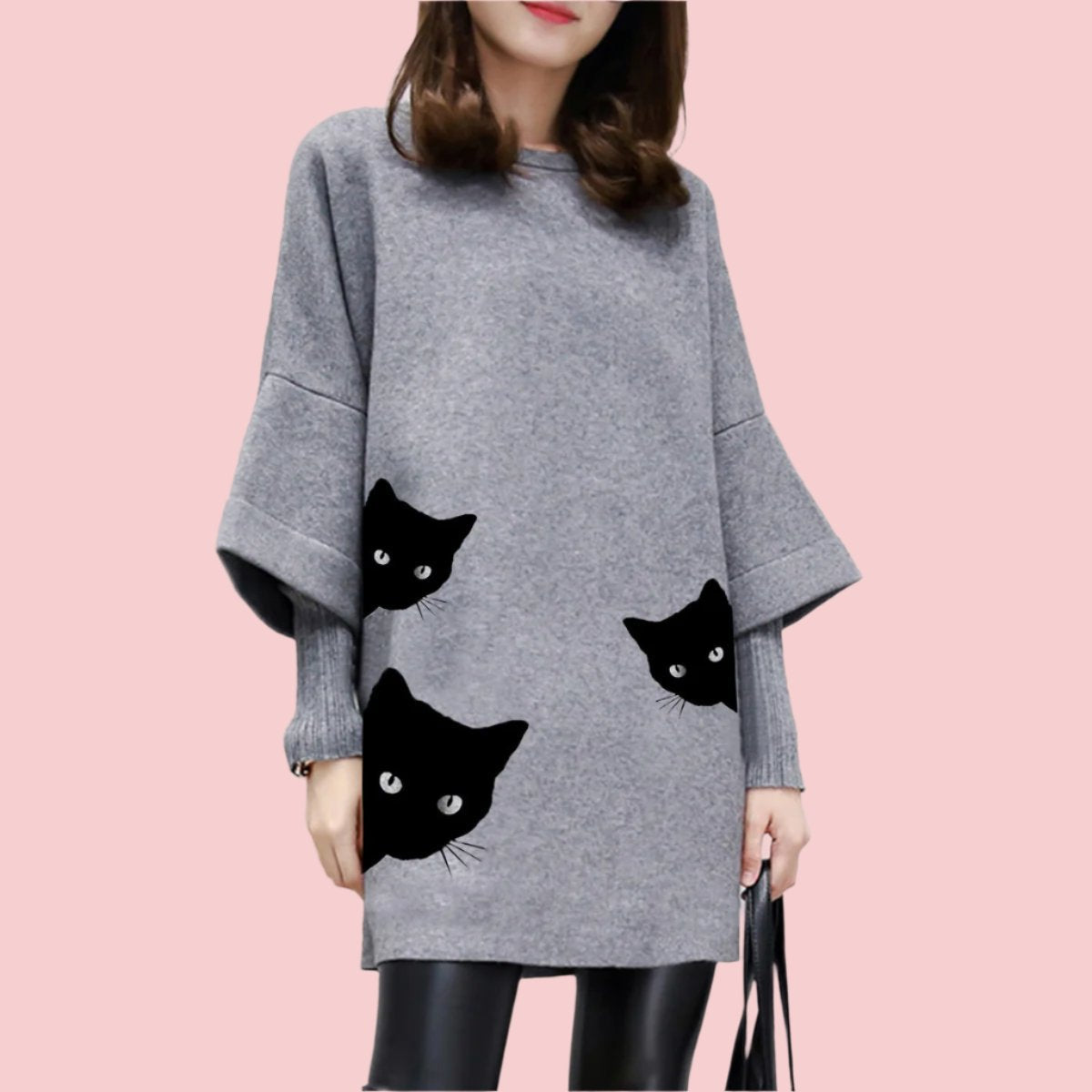 Voel je stijlvol en comfortabel in de Mayla trui, een unieke mix van urban flair en speels design. Deze grijze trui, die tot net boven de knie valt, is een must-have voor elke modebewuste vrouw die graag haar persoonlijkheid uitstraalt. Het zwarte kattenhoofd op de voorkant geeft de trui een opvallend detail dat je outfit meteen tot leven brengt.