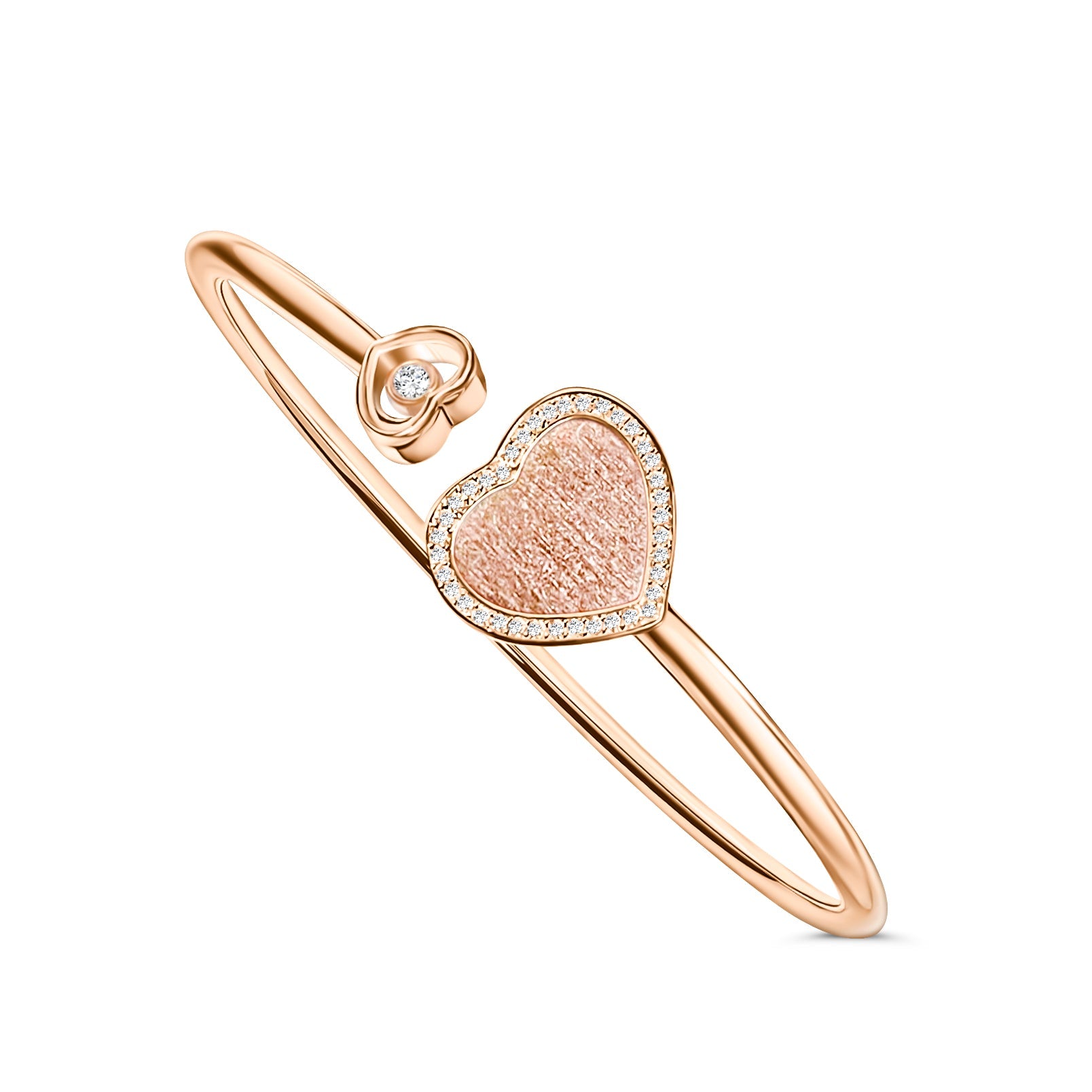 - Ontwerp: Elegante en moderne armband met twee hartvormige uiteinden, waarvan één is ingelegd met parelmoer en sprankelende diamanten, en het andere een vrij bewegende diamant bevat. Perfect als statement van liefde en verfijning.